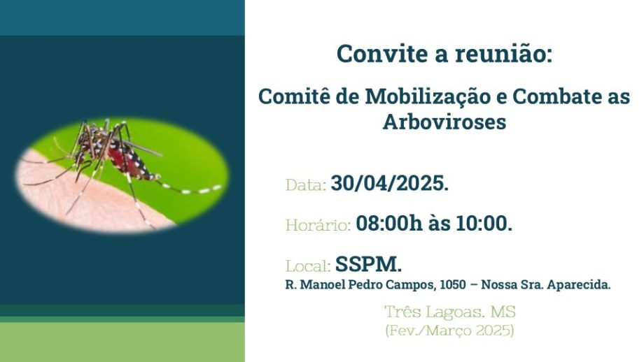 A Prefeitura de Três Lagoas, por meio da Secretaria Municipal de Saúde (SMS), convida toda população para participar da reunião do Comitê de Mobilização e Combate as Arboviroses, que acontece na quinta-feira (30), a partir das 8h.