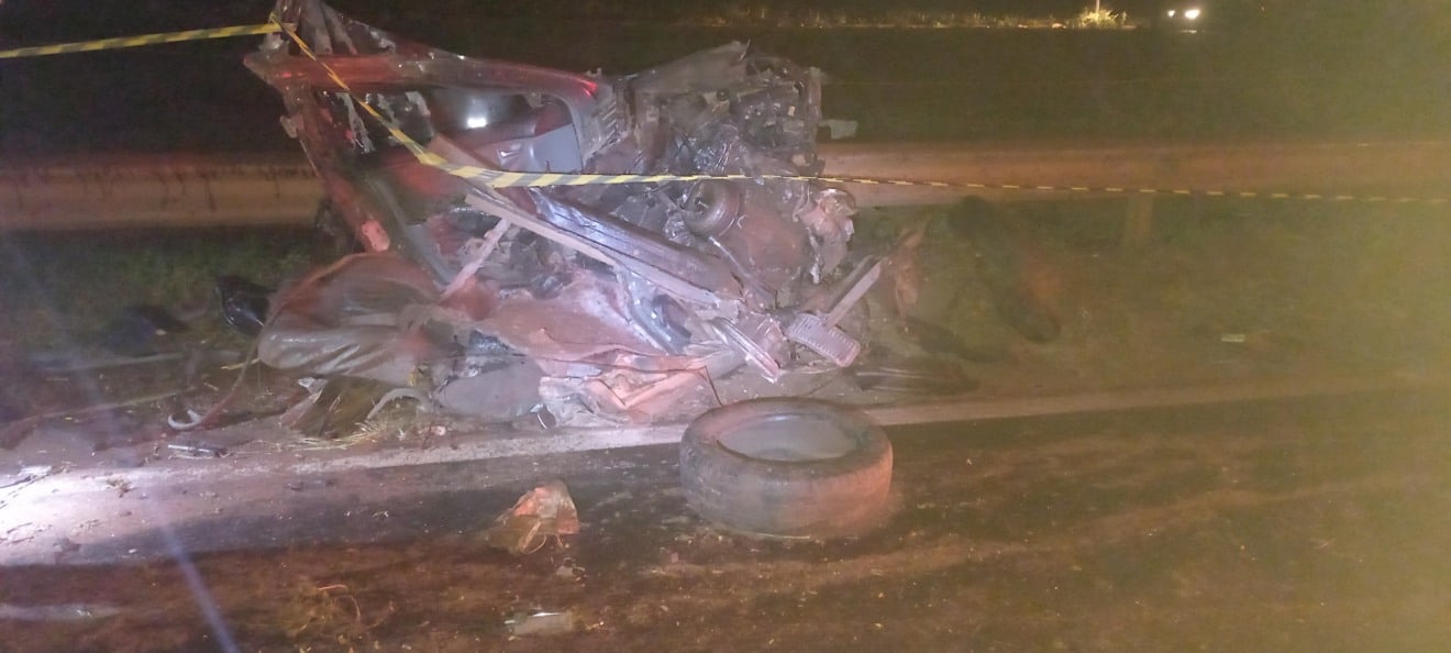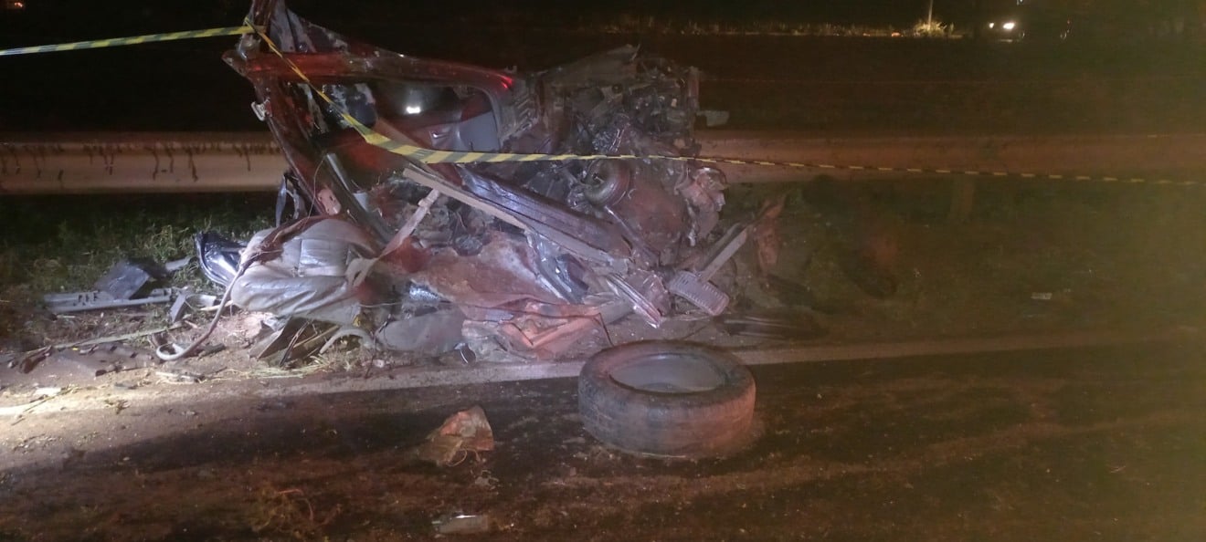 Desgovernado, o veículo invadiu a pista contrária e colidiu violentamente contra uma carreta. O impacto foi tão intenso que o automóvel se partiu em múltiplas partes, espalhando destroços por mais de 50 metros — distância aproximada de onde a carreta conseguiu parar após a batida.