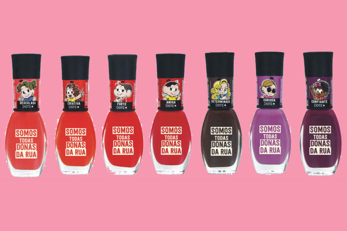 A linha, que leva o nome de #DONASDARUA by Dote, traz uma paleta com 12 cores diferentes e democráticas, entre tons variados de vermelho, roxo, cor-de-rosa, azul, preto, marrom e cinza, cada um deles fazendo referência a Mônica, Magali, Rosinha, Marina e mais. Além dos esmaltes de textura ultracremosa e secagem rápida, a coleção conta, também, com outros seis vidros em versão duo, com cores cremosas e glitter, tudo no mesmo tubinho.