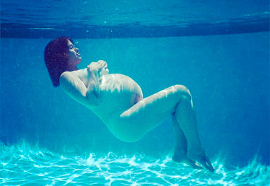 Completamente nua durante um mergulho na piscina, a cantora, de 41 anos, mostrou o barrigão e conquistou elogios pela fotografia postada.