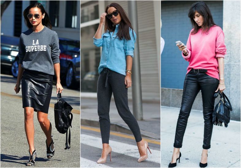Essa é uma das combinações mais descoladas da atualidade. Sandálias de tiras finas e scarpins nos pés criam o contraste perfeito com o moletom. Use sem medo! Vale completar com camisas de tecidos mais finos ou tricôs.