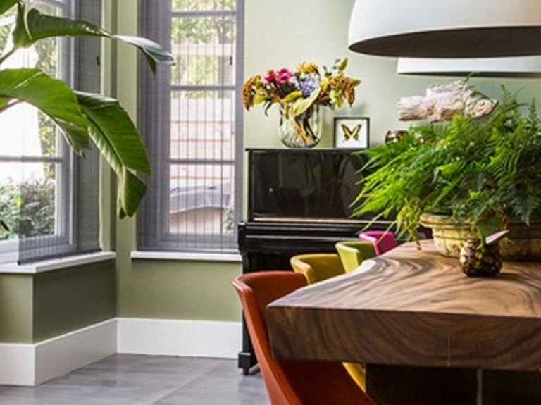 A sala de jantar criada pela designer de interiores Roelfien Vos mostra como poucos itens bens escolhidos são capazes de originar um ambiente cheio de personalidade. Tomando como referência a exuberância das florestas tropicais, a alemã inseriu elementosrústicos e naturais em um contexto residencial. Enquanto a mesa com tampo de madeira maciça mostra os veios de uma grande árvore, arranjos e vasos com folhagens verdes implantam um mood selvagem que fica ainda mais refrescante graças à iluminação abundante e ao leve tom de verde eleito para as paredes. O contraponto urbano fica por conta cadeiras com sotaque modernista e os enormes pendentes circulares sobre a mesa.