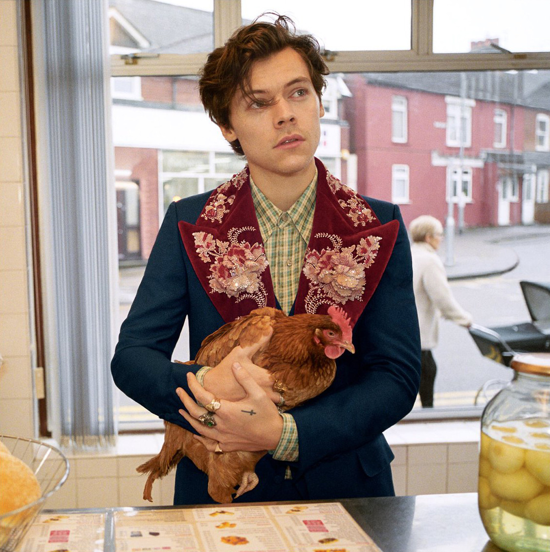 O cenário é um tradicional restaurante de fish and chips no norte de Londres, e Harry posa com galinhas e cachorros, elegantemente vestido com ternos completos modernizados com os tênis hits da Gucci. Muitas pessoas nas redes sociais relembraram do estilo do personagem Chuck Bass, da extinta série Gossip Girl. O milionário de Manhattan era fã de conjuntos completos de alfaiataria e, principalmente, chegado em estampas e cores.