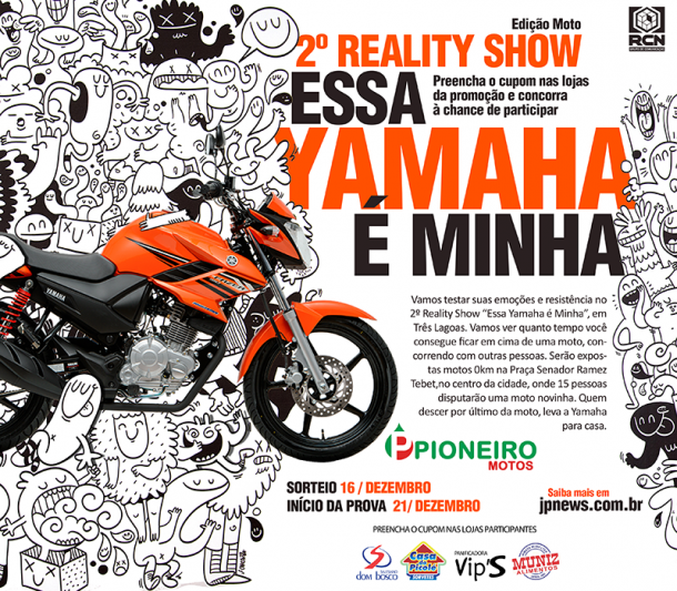 O Reality Show RCN/Yamaha “Essa Yamaha é minha”, promovido pelo Grupo RCN de Comunicação, Pioneiro Motos Yamaha e a Associação Comercial e Industrial de Três Lagoas, agita a cidade e já conta com diversos participantes, como também parceiros. As inscrições poderão ser realizadas até o dia 15 de dezembro e para participar do sorteio de uma motocicleta 150 CC zero quilômetro é preciso comprar em uma das lojas credenciadas pela promoção, preencher o cupom e colocá-lo na urna disponível dentro do estabelecimento.