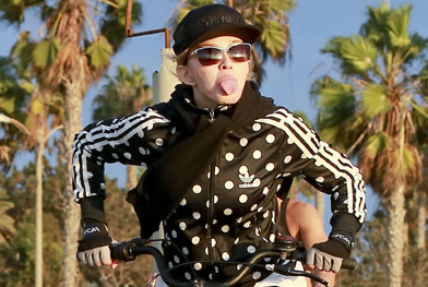 No último domingo (18), Madonna mostrou toda sua irreverência ao curtir um dia de folga em sua agenda tão atribulada. A Rainha do Pop, que passeava de bicicleta, percebeu que estava sendo clicada pelos profissionais e fez questão de mostrar a língua para eles.