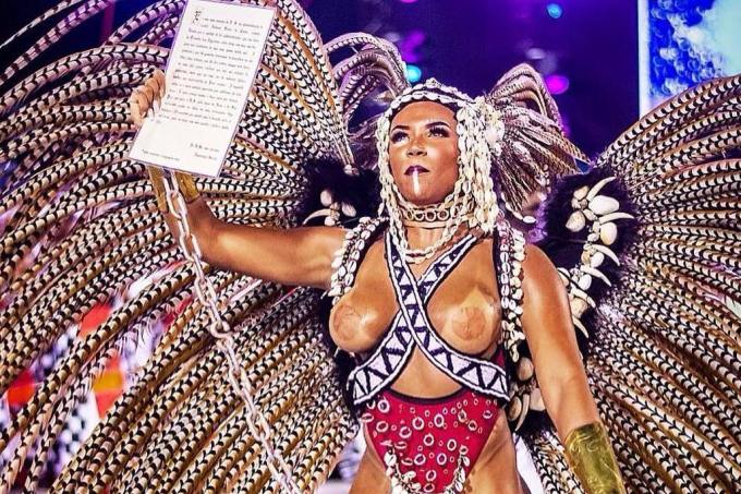 Evelyn Bastos foi a rainha de bateria da Mangueira e representou na passarela a força de Esperança Garcia, negra escravizada, considerada a primeira mulher advogada do Piauí.