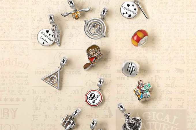 Será 13 opções de charms que incluem o Harry, pomo de ouro, o símbolo da Escolha de Magia e Bruxaria de Hogwarts, o vira tempo, o símbolo das Relíquias da Morte, o Chapéu Seletor e separadores de charms com o símbolo da Grifinória, um escrito HP entre outros.