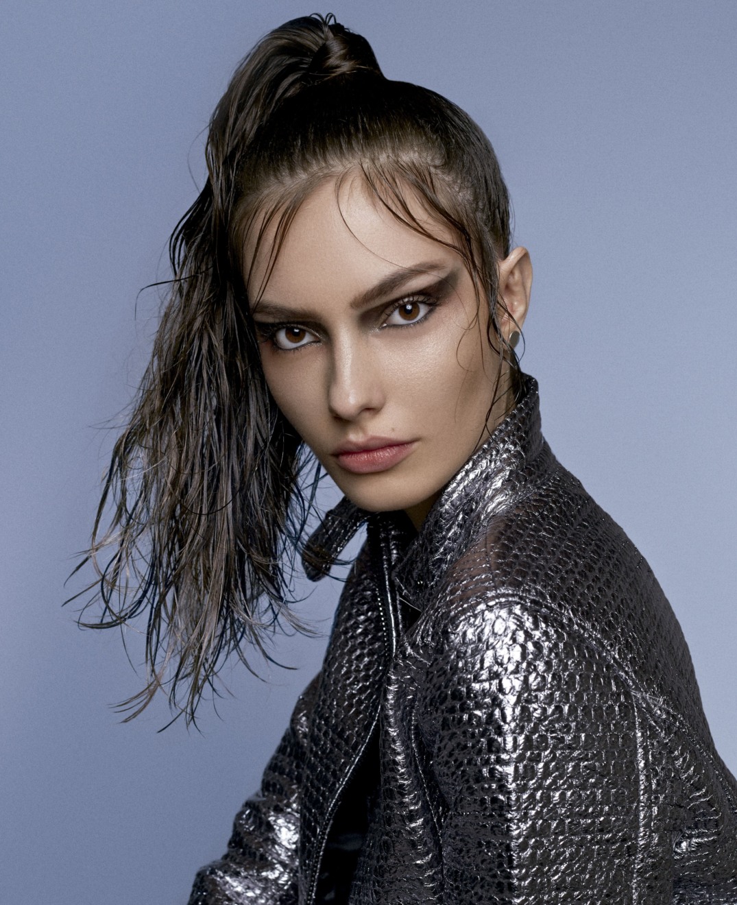 A maquiagem supergráfica fica leve com a mistura de uma sombra mais clara com a prata metalizada. Priorize os cantos internos para iluminar o olhar.
