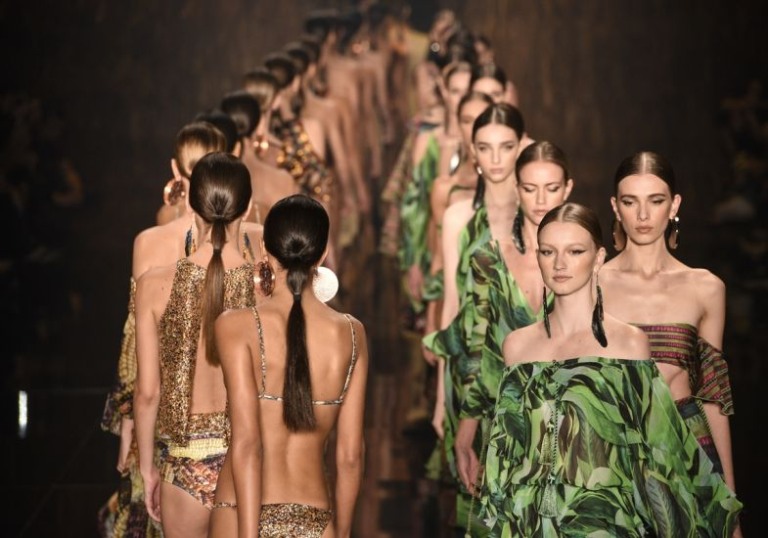 O pós-praia era leve e fluído, com saias rodadas, babados mil e maiôs que misturavam elastano e seda. Já os bordados foram um verdadeiro show à parte, dando o toque glamouroso de que falamos mais cedo – para exemplificar, pense em franjas de canutilhos dourados e aves silvestres feitas de miçanga.