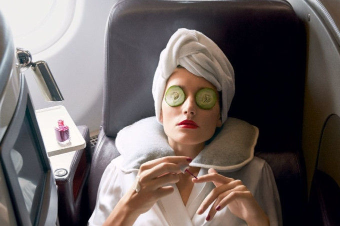 Viagens longas – aquelas que duram mais de seis horas – demandam alguns cuidados com a pele além da aplicação do creme hidratante. Uma solução para manter o rosto sempre tinindo é borrifar água termal em diferentes momentos do voo. O hábito ajuda a proteger a pele dos efeitos do ar seco dentro da aeronave, além de promover uma sensação refrescante no rosto.