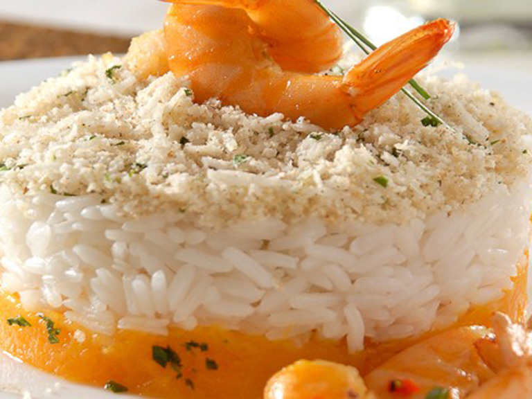 Montagem: sobre o prato em que for servir, coloque um aro 10 cm de diâmetro. Arrume uma camada de purê de abóbora, uma de arroz e, por último a farofa. Retire o aro e sirva com o camarão refogado.