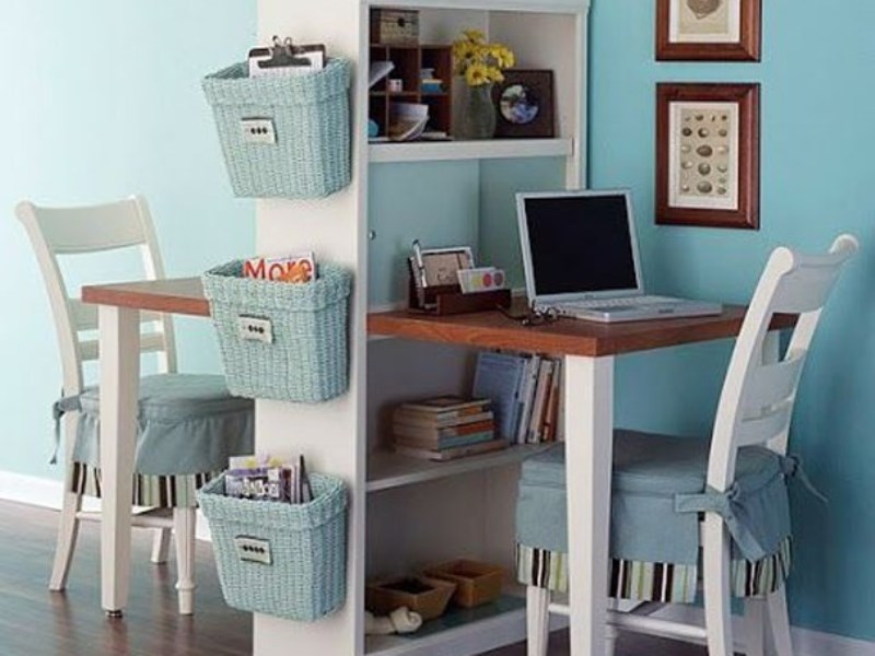 Ideal pra espaços pequeninos ou pra casas onde não existe o cômodo escritório. Notou que o móvel é a divisória das duas estações de trabalho?