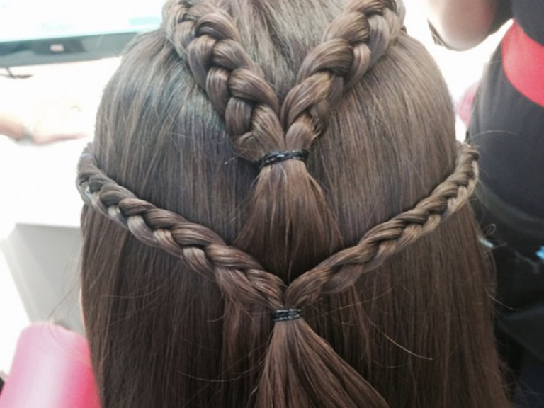 Una as duas tranças do topo e depois as duas tranças laterais com elásticos de silicone. Coloque o rabo que sobrou das duas tranças do topo por baixo das duas tranças laterais